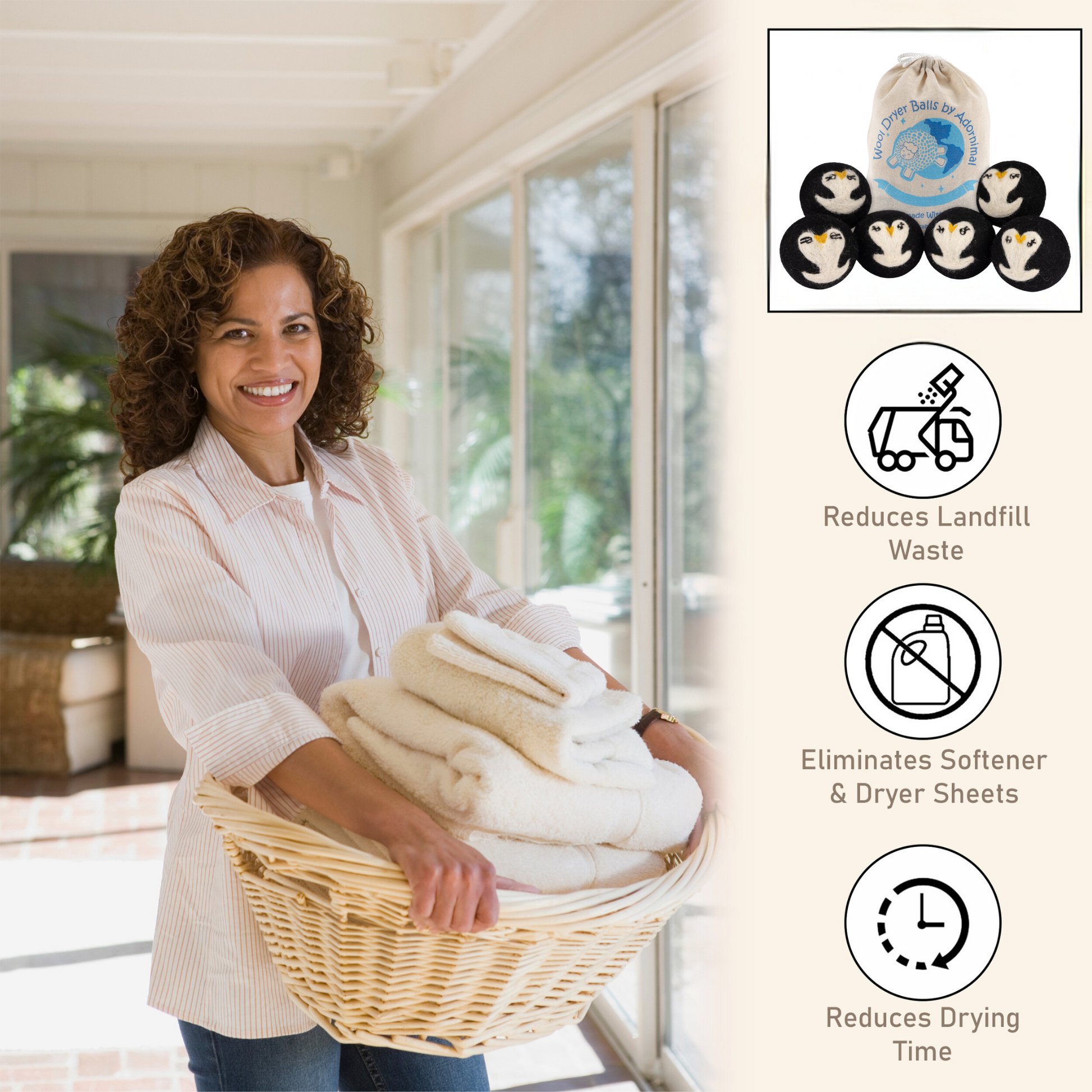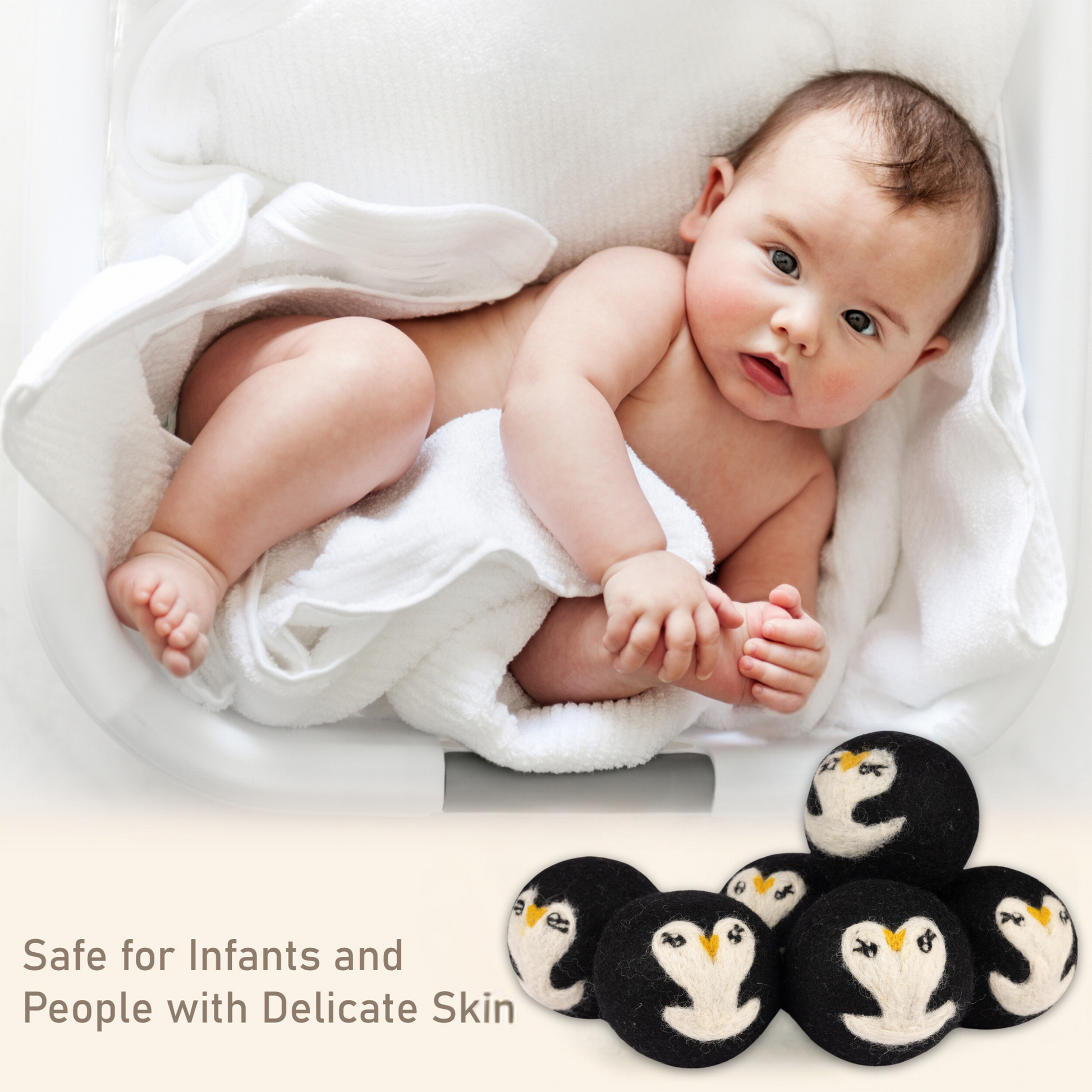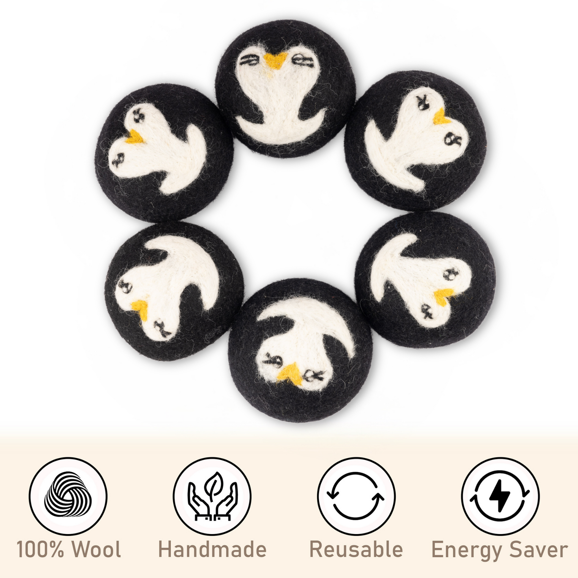 WHAT YOU GET: Our wool balls for dryer comes in a bundle of six pieces, designed as adorable Penguin animals that you will surely fall in love with. Also comes with a drawstring gift bag for storage and an instruction card on how to use it.