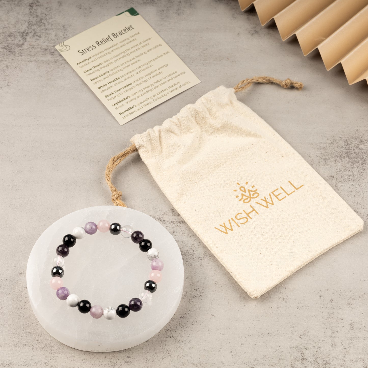 Discover tranquility and balance with our Stress Relief Crystal Bracelet & Tumble Stone Set, thoughtfully designed to promote relaxation and inner peace. This exquisite set includes a handcrafted bracelet made with a harmonious blend of powerful crystals, alongside a collection of soothing tumble stones, all nestled in a chic canvas bag for safekeeping.
