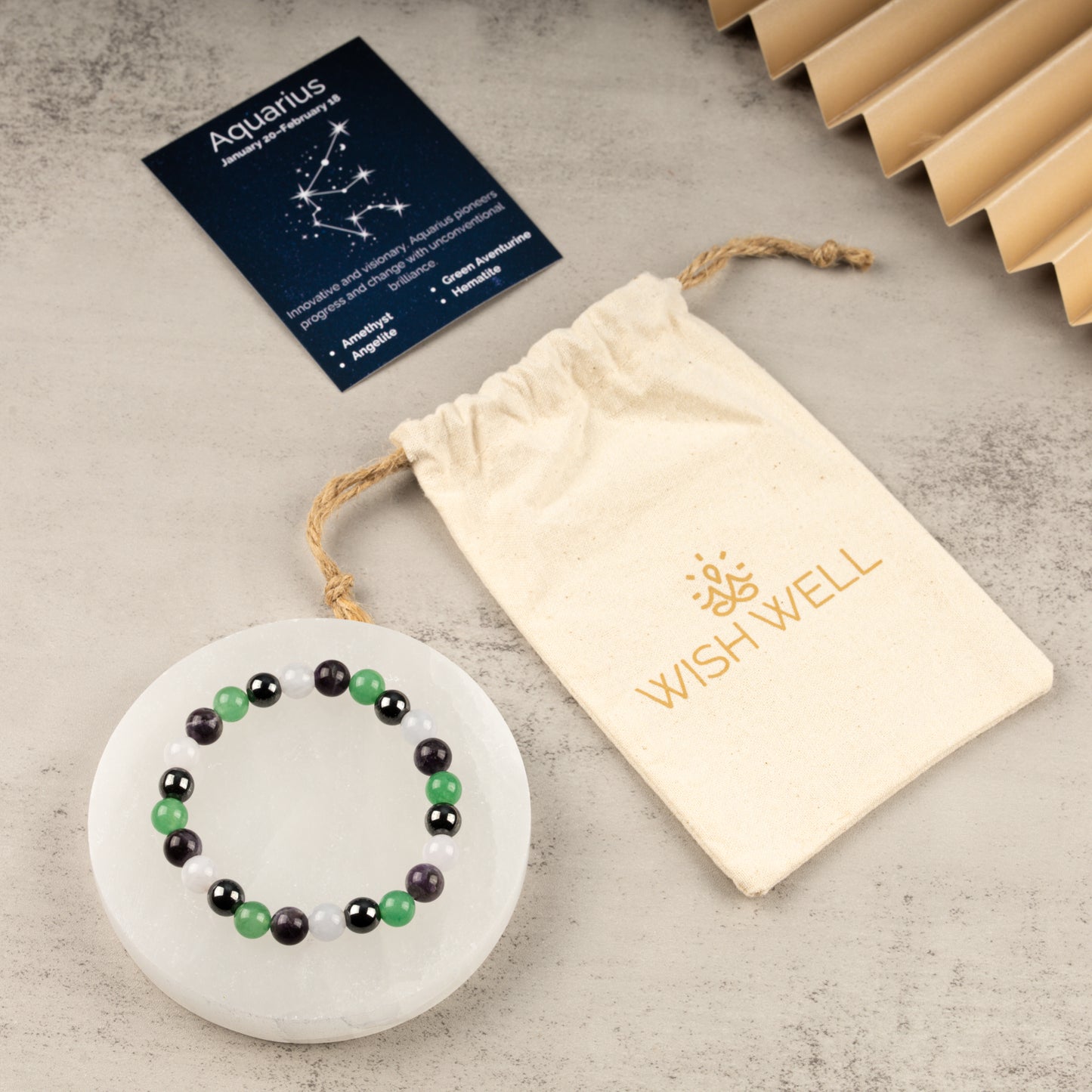Looking for the perfect birthday or anniversary gift for the special Aquarius person in your life? Look no further than this stunning Aquarius zodiac bracelet with natural amethyst, angelite, green aventurine, and hematite crystals.
