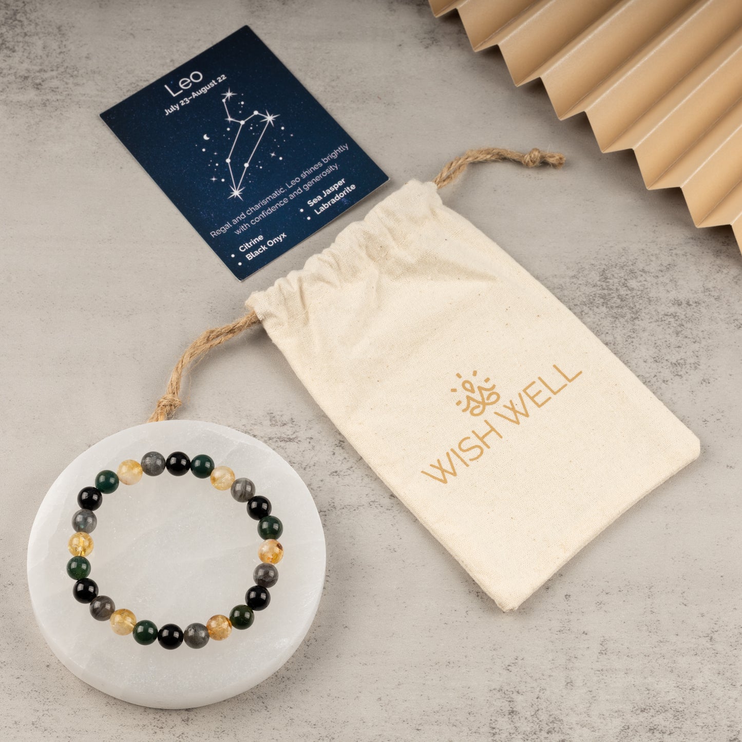 Each bracelet is meticulously crafted with a powerful combination of citrine, black onyx, sea jasper, and labradorite crystals, chosen specifically to amplify the bold energy of Leo. Together, these crystals create a harmonious blend of energies that can support a Leo person in their journey toward balance and fulfillment.