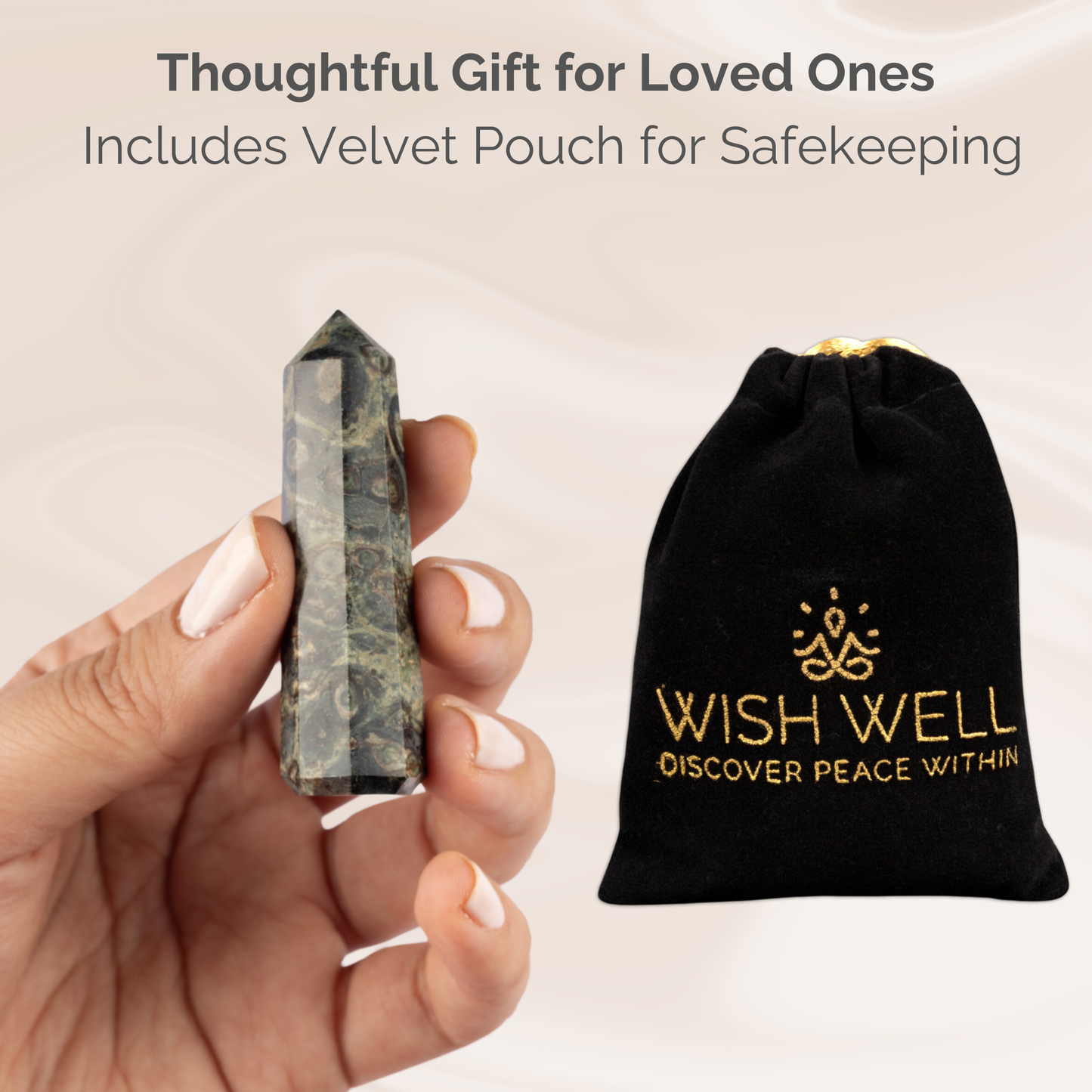Crystal Gifts: Packaged in a velvet pouch, this Kambaba Jasper obelisk crystal tower is ready for gifting, making it an ideal present for birthdays, anniversaries, or any special occasion.