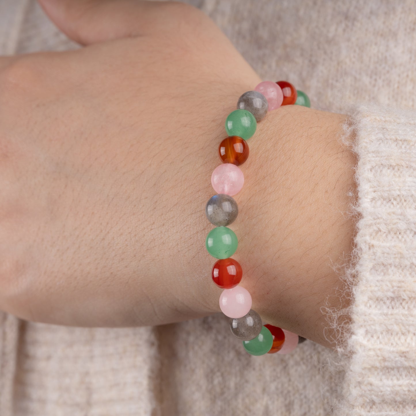 Each bracelet is meticulously crafted with a powerful combination of carnelian, labradorite, green aventurine, and rose quartz crystals, chosen specifically to amplify the bold energy of Taurus. Together, these crystals create a harmonious blend of energies that can support a Taurus person in their journey toward balance and fulfillment.