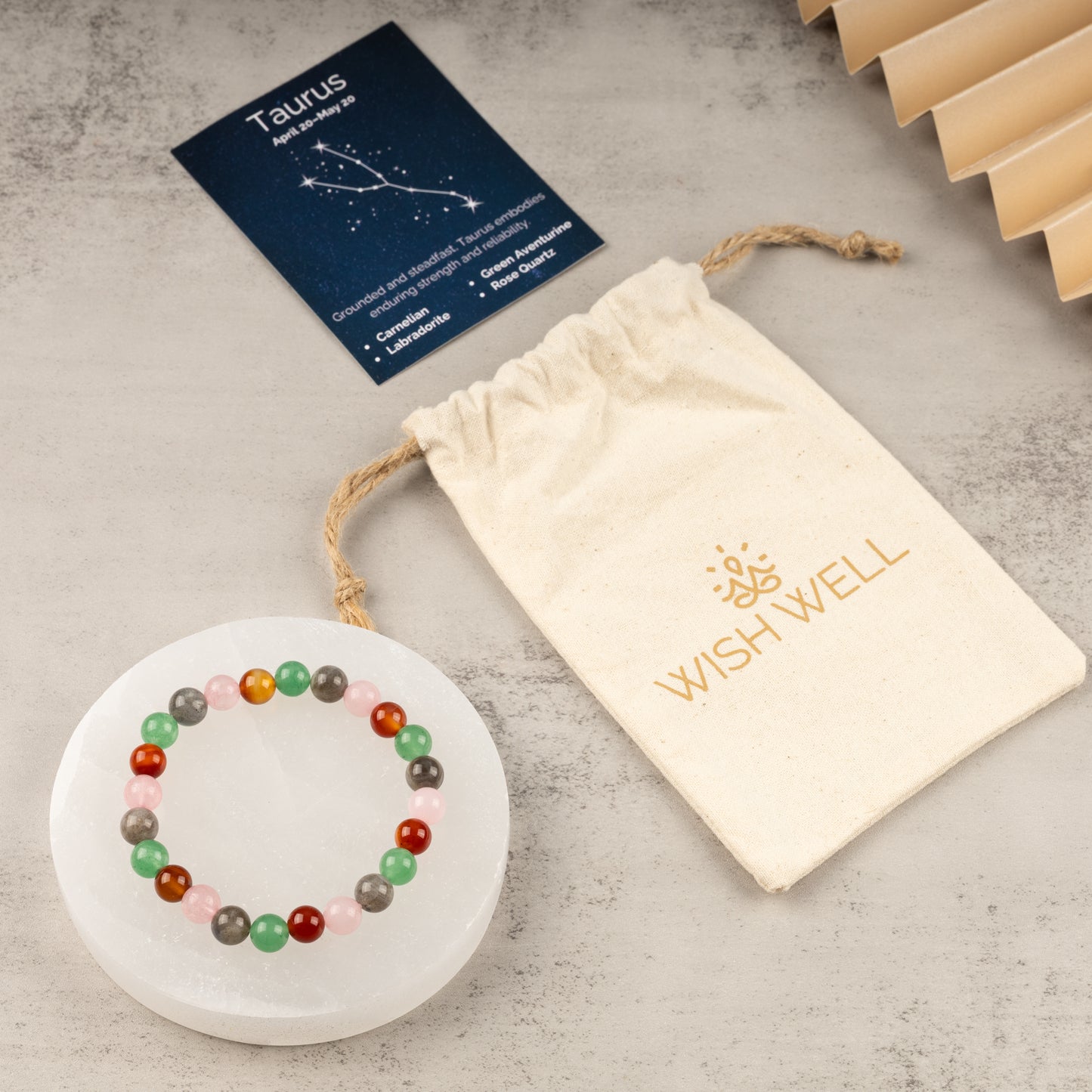 Give the gift of handmade beauty and positive energy with this bracelet and crystal set designed specifically for those born under the sign of Taurus.